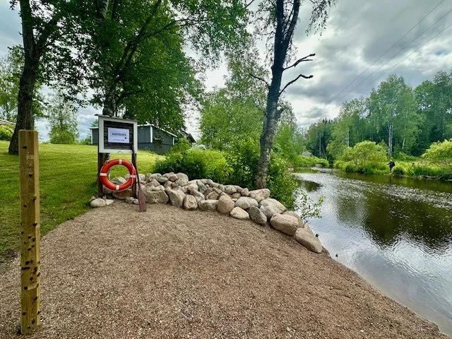 Puistomainen venesatama, josta lyhyt jokiyhteys Karvianjärveen