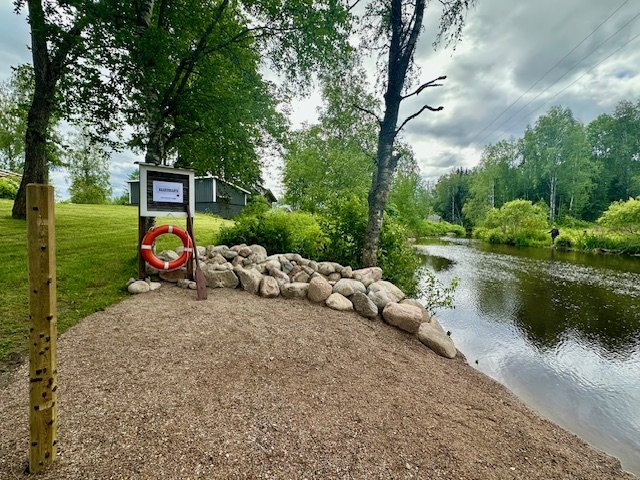 Puistomainen venesatama, josta lyhyt jokiyhteys Karvianjärveen.